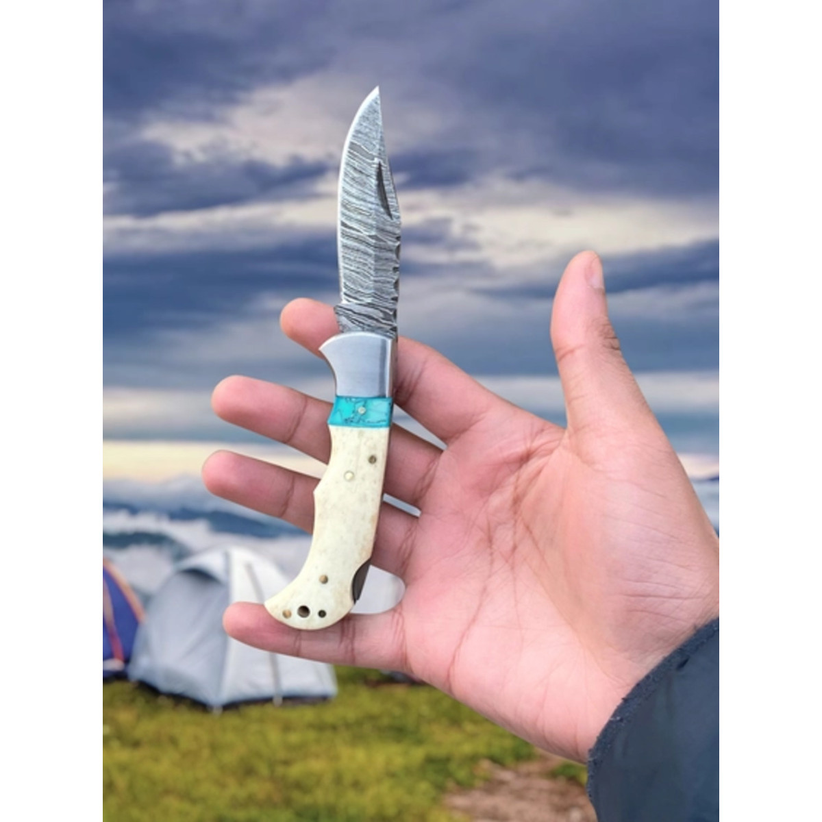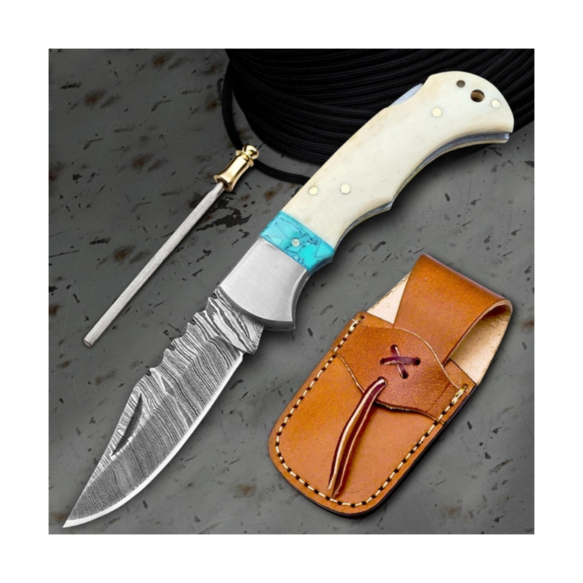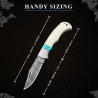6.5" Handmade Damascus Folding Knife + Leather Sheath | 300-Layer Steel