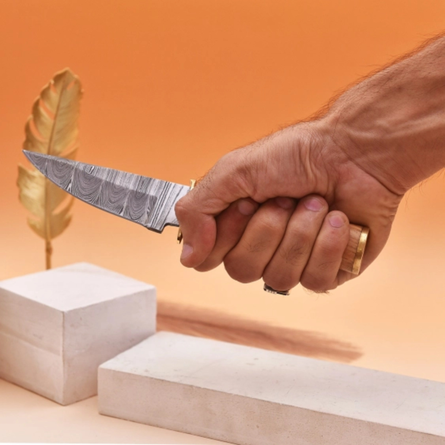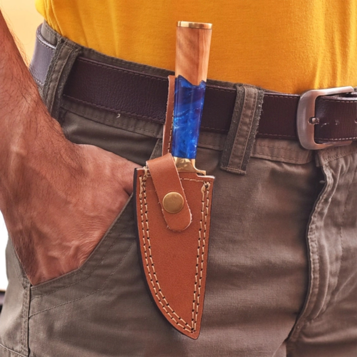 8" Handmade Damascus Knife | Artistic Handle, Leather Sheath, Twist Pattern 300 Layers