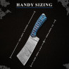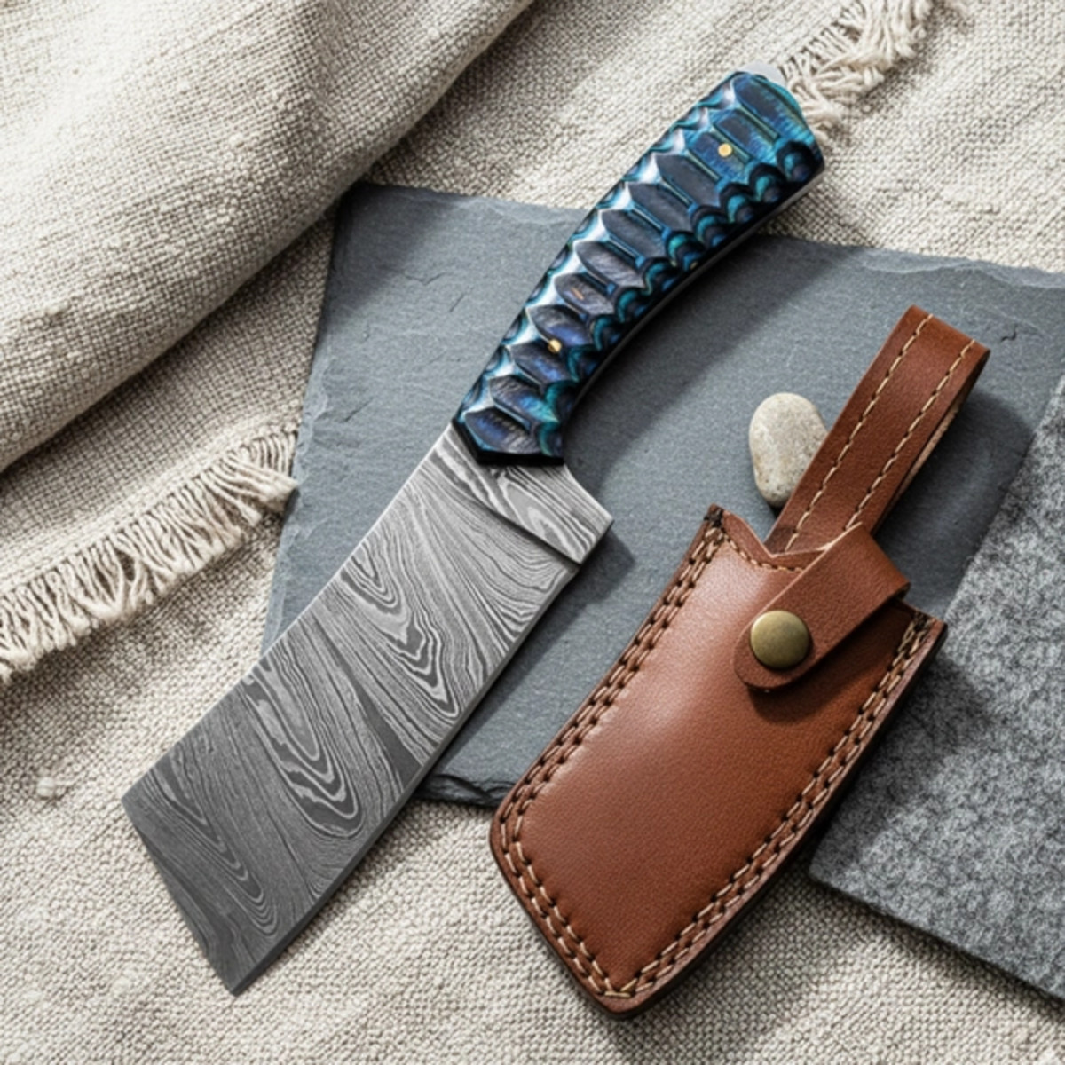 8.25" Handmade Damascus Cleaver Knife | Ocean Scales Resin-Stabilized Handle, Leather Sheath