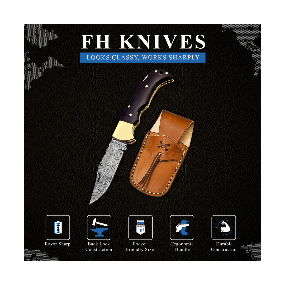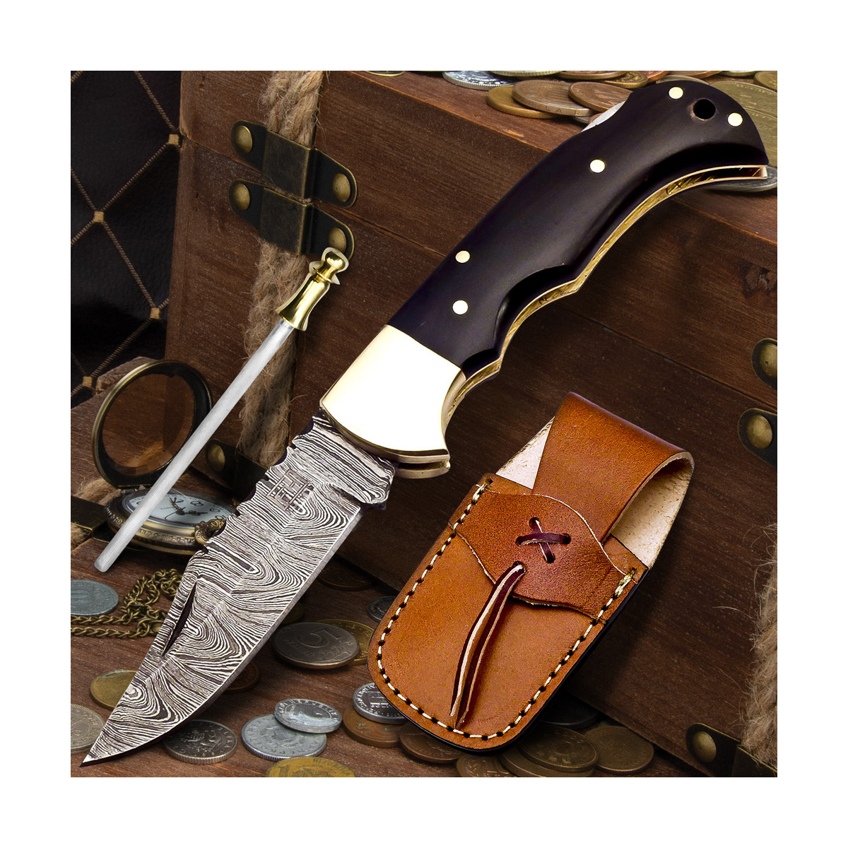 Складной нож 6.5" Handmade Damascus Folding Knife + кожаные ножны