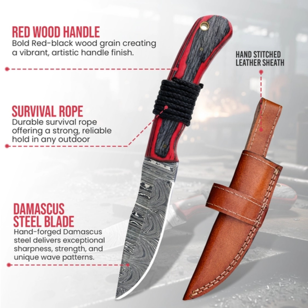 🌲 Рукоять из композитного дерева (wood+resin) — прочная, влагостойкая, с ярким красно-чёрным узором.