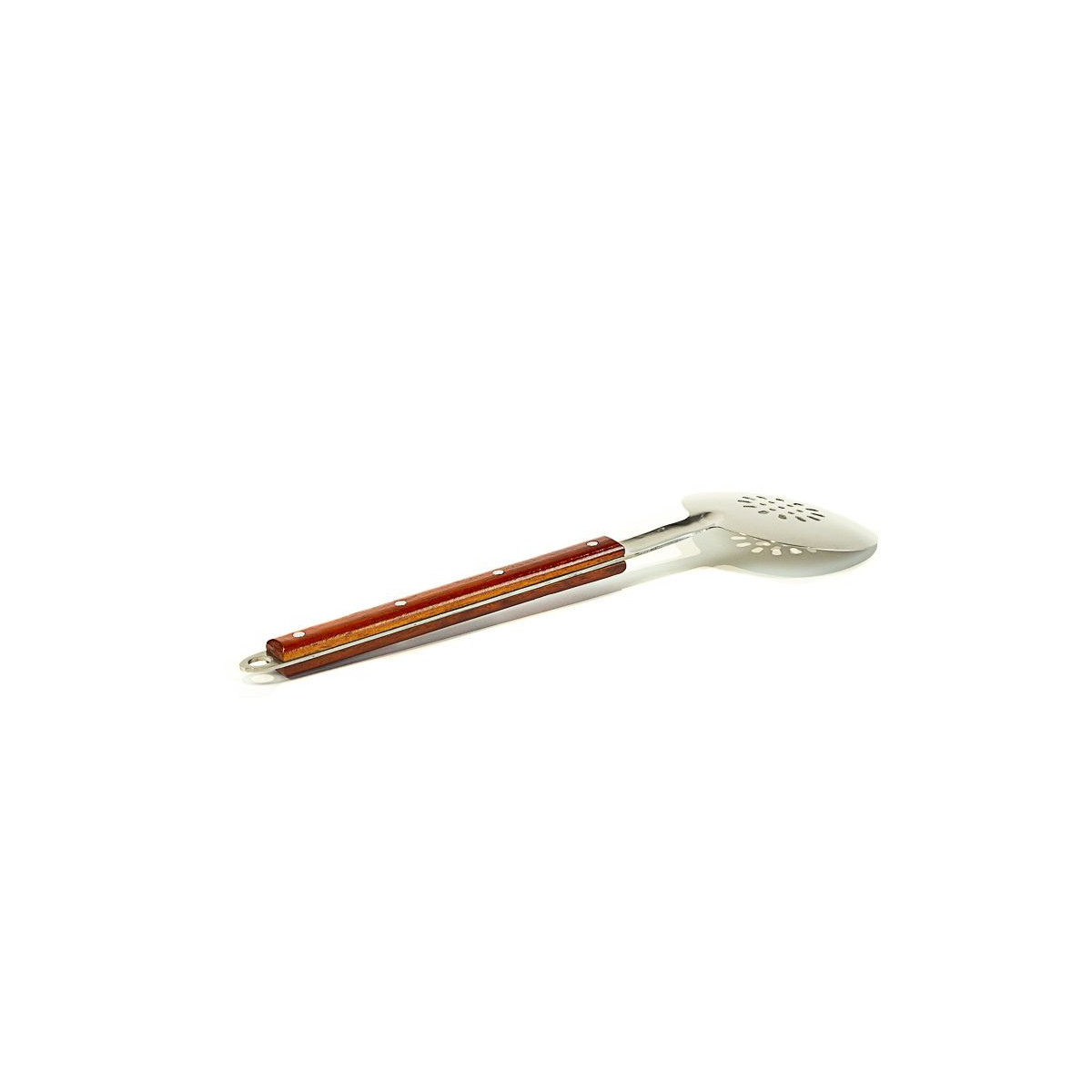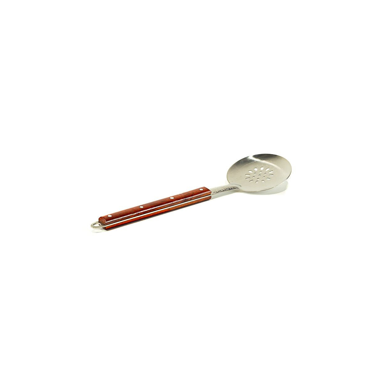 Шумовка выполнена из высококачественной нержавеющей стали и оснащена деревянной ручкой для удобства и безопасности. Благодаря небольшой петле в рукоятке шумовки ее можно повесить на кухне.